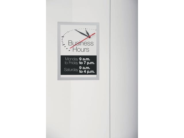 Den magnetiske DURAFRAME® Sun-inforammen er en enkel og effektiv måte å vise frem skilter, plakater og andre meldinger på. Det er bare å trekke av beskyttelsespapiret og feste den klebrige baksiden til en glatt og fast overflate, for eksempel vinduer, slik at informasjonen kan leses fra begge sider. Den magnetiske lukkeren sikrer at innleggene holdes på plass. I tillegg gjør det nedbrettbare magnetiske frontpanelet det lett å fjerne og skifte ut innlegg. Disse plakatene kan flyttes etter at de er festet på glassflater og vinduer, uten at noe av plakaten rives av og blir sittende igjen på overflaten. Man kan også vise frem budskapet på plakaten slik at det er synlig på begge sider av vinduet eller glassflaten, eller ha forskjellige budskaper på hver side.