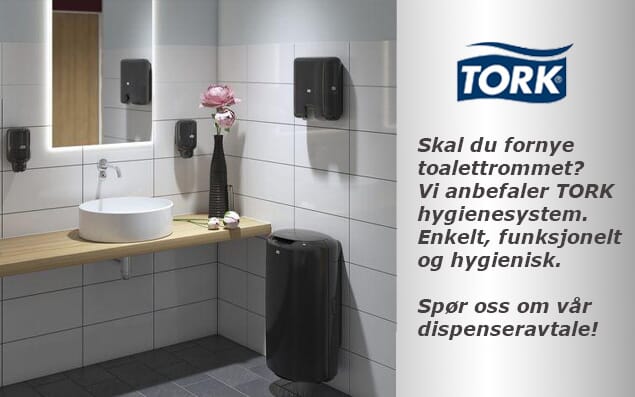 Skal bedriften fornye eller bygge nytt? Vi tilbyr dispenseravtale for Tork hygienesystem. Ved uttak av 9 dispensere (tørk, toa og såpe) tilbyr vi gratis dispensere mot avtale om kjøp av papir og såpe i et tidsrom på 3 år. Tork tilbyr kvalitetsdispensere i sort eller hvitt i kontrakten.