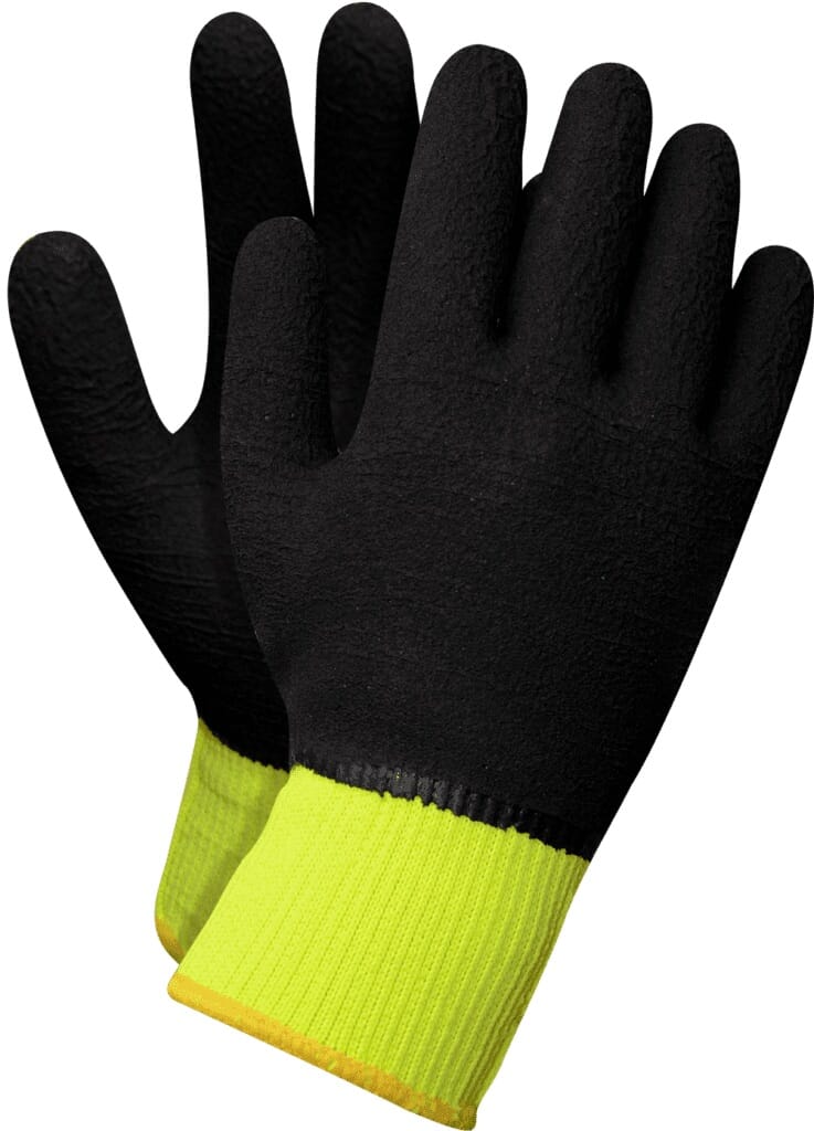 Sømløs strikket hanske av gul polyester med Frotte innside for beskyttelse mot kulde (7G). hel dyppet til håndleddet i svart slitesterk lateks skum.