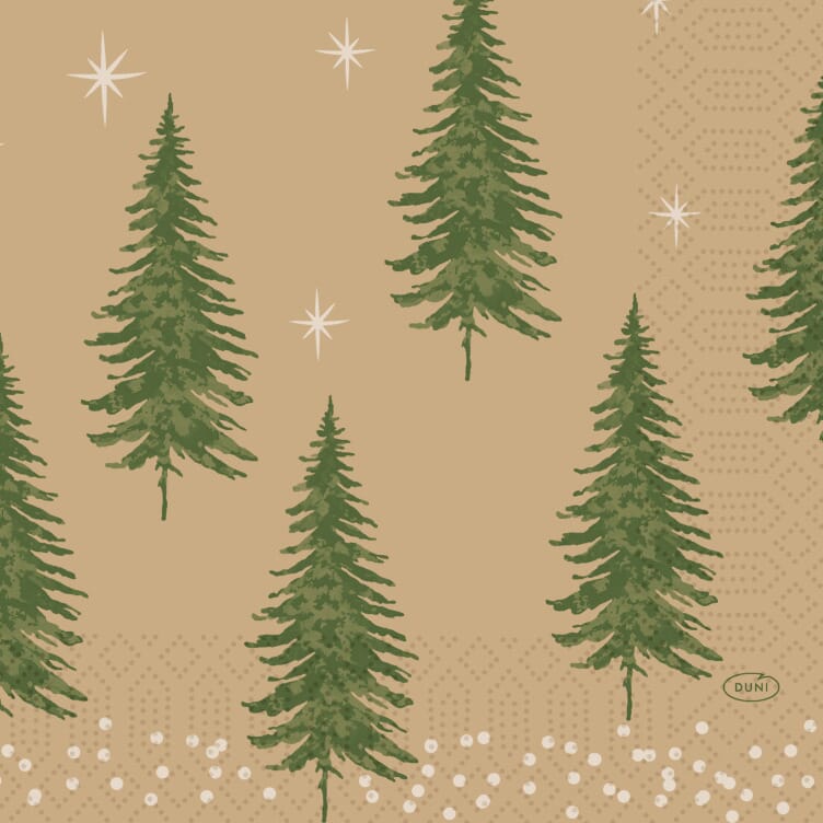 Tissueservietter i serien Humble Trees, et sjarmerende design av grantrær på en snørik dag, mot en varm brun bakgrunn.