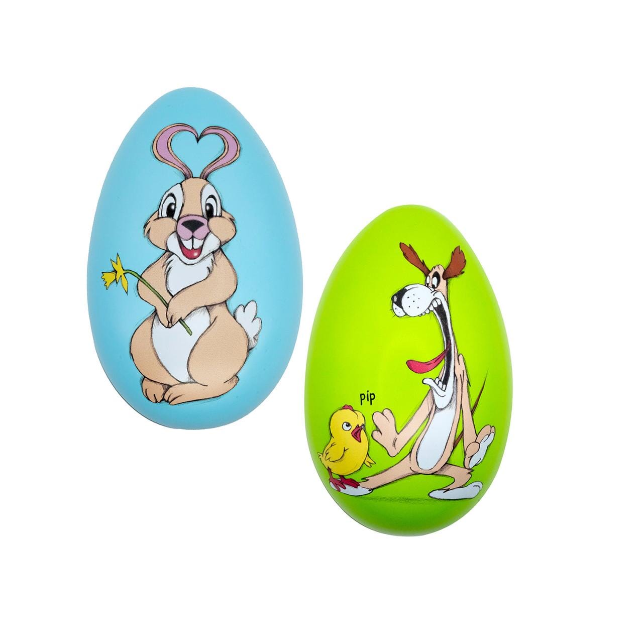 Et herlig påskeegg med koselige påskemotiv av Lasse Åberg i blått eller grønt.