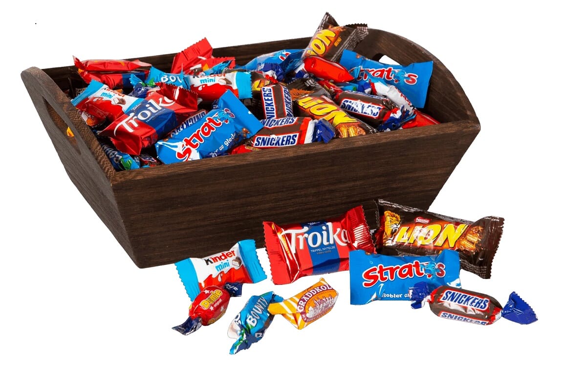 Trauet er fylt med et variert utvalg av populære søtsaker og snacks, nøye sammensatt for å treffe mange ulike smaker. Her får mottakeren en rik blanding av sjokolade, karamell, fruktige godbiter og tradisjonelle klassikere – en gave som kan deles på kontoret, med familien eller nytes ove