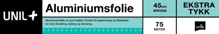 Ekstra tykk aluminiumsfolie for oppbevaring og tildekking av mat, til steking, baking og damping. Kommer i en praktisk cutbox med avrivningskant. Bredde: 45 cm. Lengde: 75 m. Tykkelse: 18 MY. Egnet temperaturområde: -20 °C til 300 °C.