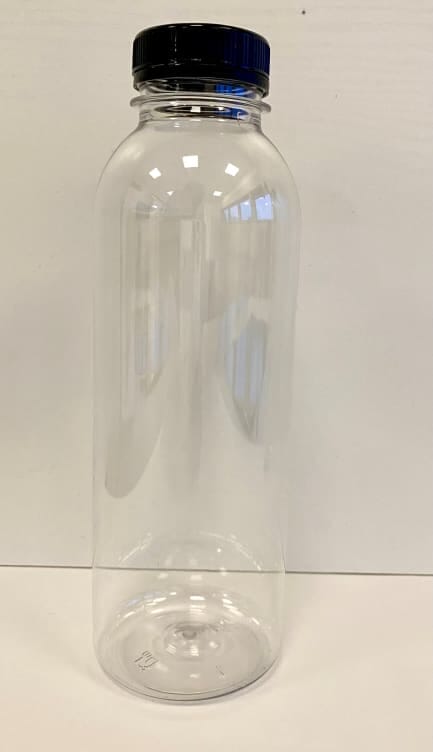 Transparent plastflaske med sort kork. Klassisk rund form gjør flasken til et populært valg til juice, smoothie og andre kalde drikker. Finnes i flere størrelser. Flasken er fremstilt av PET og er resirkulerbar.
