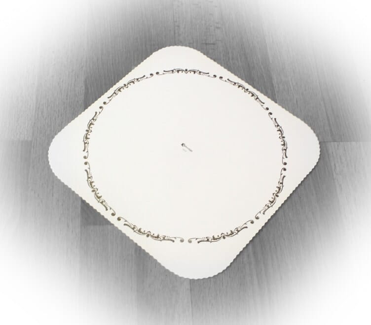 Hvitt kakebrett m/gull dekor. Godkjent for direkte kontakt med næringsmidler. Produsert i Norge av rene råvarer.
