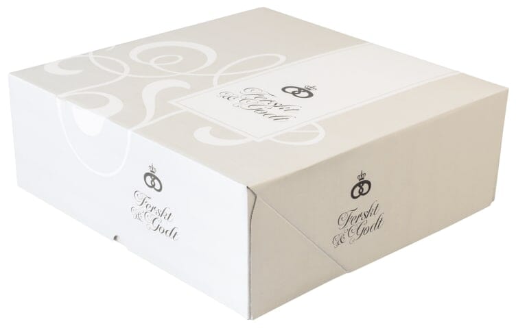 Kakeeske fra Bako standard med kvikklokk-funksjon og nytt design. Esken settes raskt sammen og har et enkelt og tidløst uttrykk. Sett gjerne på egen etikett på "båndet" på forsiden av esken. 330x330x120mm, 20 stk. FSC-merket. Det må brukes en tilstrekkelig barriere mellom matvaren og esken, f.eks et kakebrett, da det ikke skal være direktekontakt med matvarer og esken.