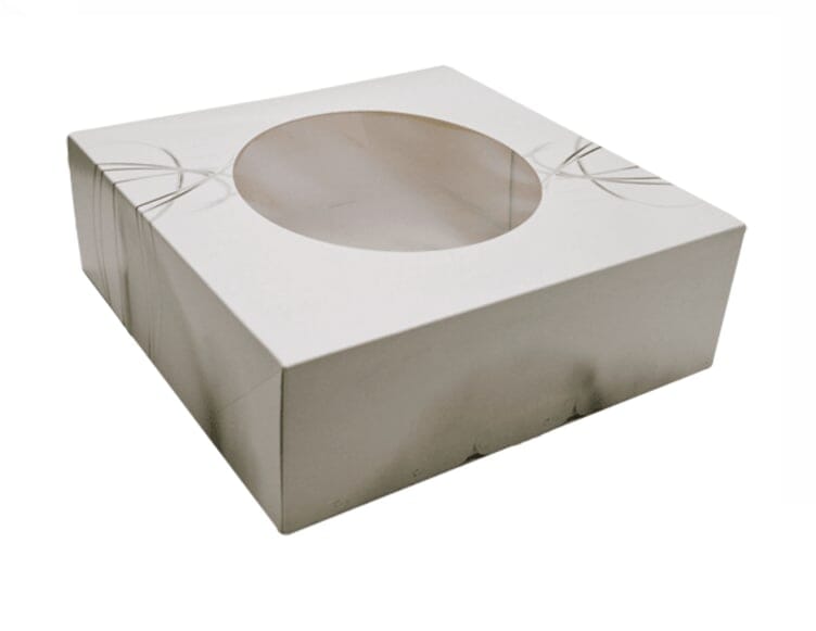 Delikat og pen kakeeske med lokk og vindu. Størrelse 33x33x11,5cm. Esken er hvit med enkelt og diskret mønster. Godkjent for direkte kontakt med tørre, fuktige, sure og fete matvarer. Kartongemballasjen er egnet for bruk under følgende temperaturer: • Fryse/kjøleskap (sakte frysing). • Romtemperatur (opptil 40° i mer enn 24 timer). • Kartongemballasjen kan ikke brukes i mikrobølgeovnen eller i en vanlig ovn.
