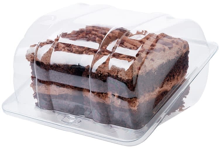 Hengslet emballasje for kakestykker. Klar bunn og lokk Innvendige mål: 125x90x81 mm Utvendige mål: 147x138x85 mm Brukes til emballering av kakestykker. Kan være i kontakt med alle type matvarer. Kan benyttes til oppbevaring over lengre tid ved romtemperatur eller lavere. Kan brukes ned til -40°C og oppvarming til 50°C i maks 2 timer.