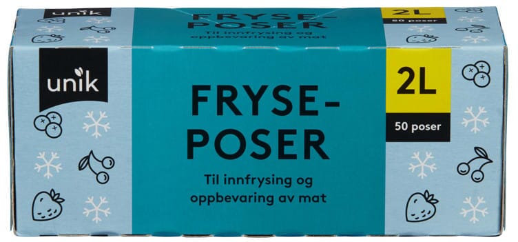 Fryseposer á to liter. Til innfrysing og oppbevaring av mat.