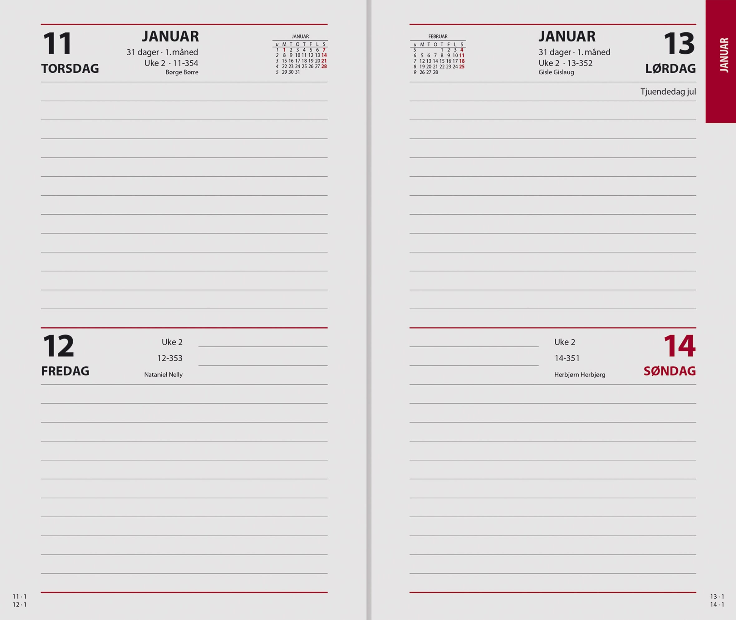7.sans Spiralkalender er en hendig fleksibel kalender. Spiralkalender har 4 dager på et oppslag. Trykte månedtabbe gjør den enkel å bruke. Alle 7.sans produkter er miljøsertifisert etter anerkjente internasjonale standarder slik at de minst mulig påvirker vårt felles ytre miljø. Sidestørrelse: 11,7 x 19,7 cm Hjørneperforering 80 gr papir To dager pr. side Norsk Røde søndager og helligdager Årsoversikt innværende og neste år Månedoversikt inneværende år Notatsider Norske navnedager © Norske helligdager