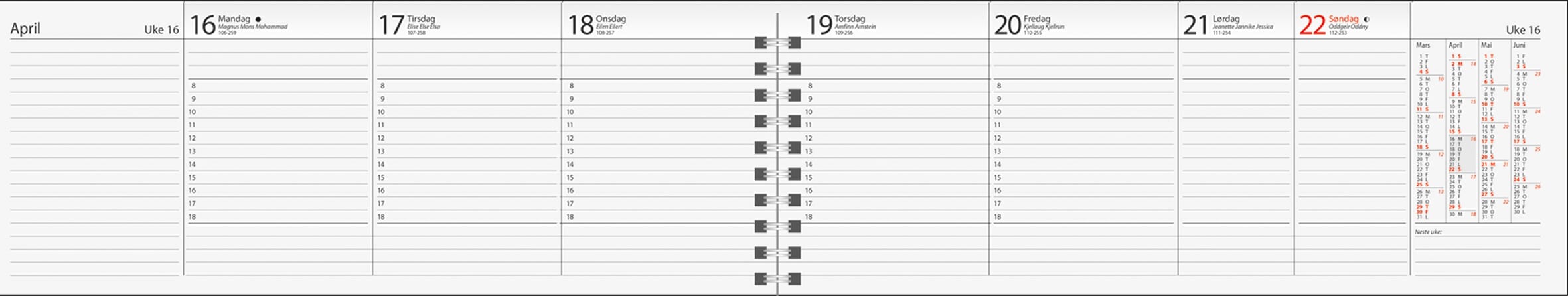 "7.sans Ukeplankalender er for mange uunnværlige på arbeidsplassen eller i hjemmet. Ukeplankalender er en kalender som er utmerket for oversikt på kontorpulten. En uke pr oppslag gir deg raskt oversikt over gjøremål. Passende stativ for pulten er artikkel nr 2717794569. Alle 7.sans produkter er miljøsertifisert etter anerkjente internasjonale standarder slik at de minst mulig påvirker vårt felles ytre miljø. Sidestørrelse: 25,5 x 9,5 cm Kartongomslag Grønn Spiralisert 80 gr papir En uke pr. oppslag Norsk Klokkeslett fra-til: 08:00-18:00 2 farger sort og rød i kalender Årsoversikt inneværende og neste år Månedosversikt inneværende og neste år Norske navnedager © Norske helligdager "