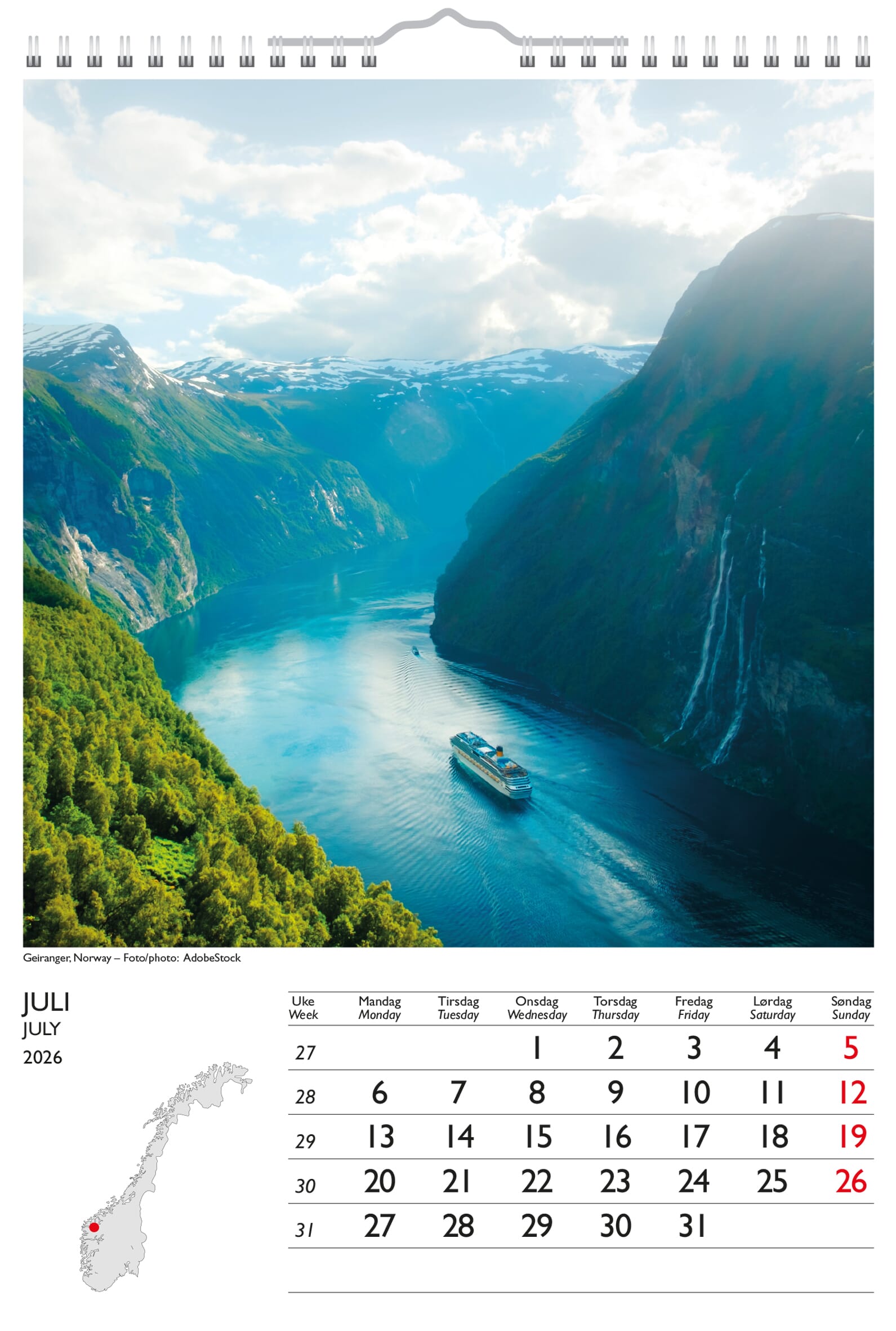 7.Sans Fjell og Fjord gir oss den daglige oversikten i hjemmet eller på kontoret. Utmerket for hjemmkontor Veggkalender med flotte motiver. Praktisk hjelp i planleggingen av en hektisk hverdag. Alle 7.sans produkter er miljøsertifisert etter anerkjente internasjonale standarder slik at de minst mulig påvirker vårt felles ytre miljø. Sidestørrelse: 29 x 41,5 cm. Spiralisert. 150 gr papir. En måned pr side. Norsk. Multifarger. Årsoversikt inneværende og neste år. Norske helligdager