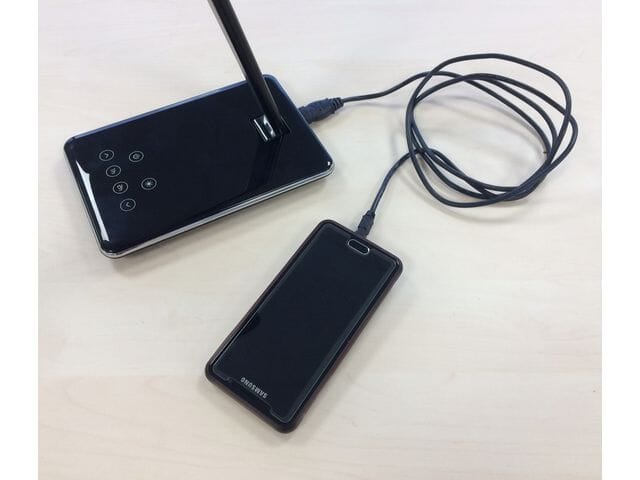 Den er utstyrt med en USB-port og en trådløs telefonlader (sertifisert Qi, kompatibel med alle
