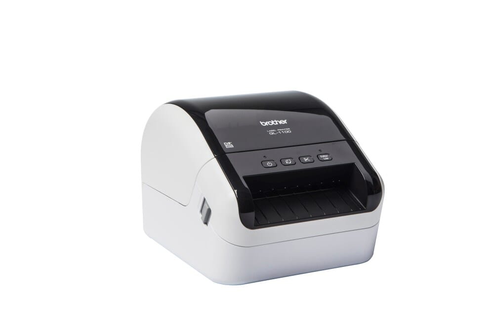 Brother QL1100c er en høyhastighets etikettskriver for utskrift av leveranseetiketter i bredt format med strekkoder for varehus og postforsendelser. Har 4-tommers (101,6 mm) utskriftsbredde og USB-tilkobling for å skrive ut fra Windows og Mac.