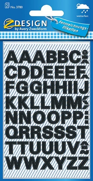 Averys selvklebende værbestandige bokstaver er den perfekte løsningen når du har behov for at merke udendørs, f.eks. på postkassen, eller i omgivelser med svingende temperaturer. Bokstavene er permanent klebende. Farge: sort. Pakke med bokstaverne A-Z. Format: 9,5 mm / 38pt.