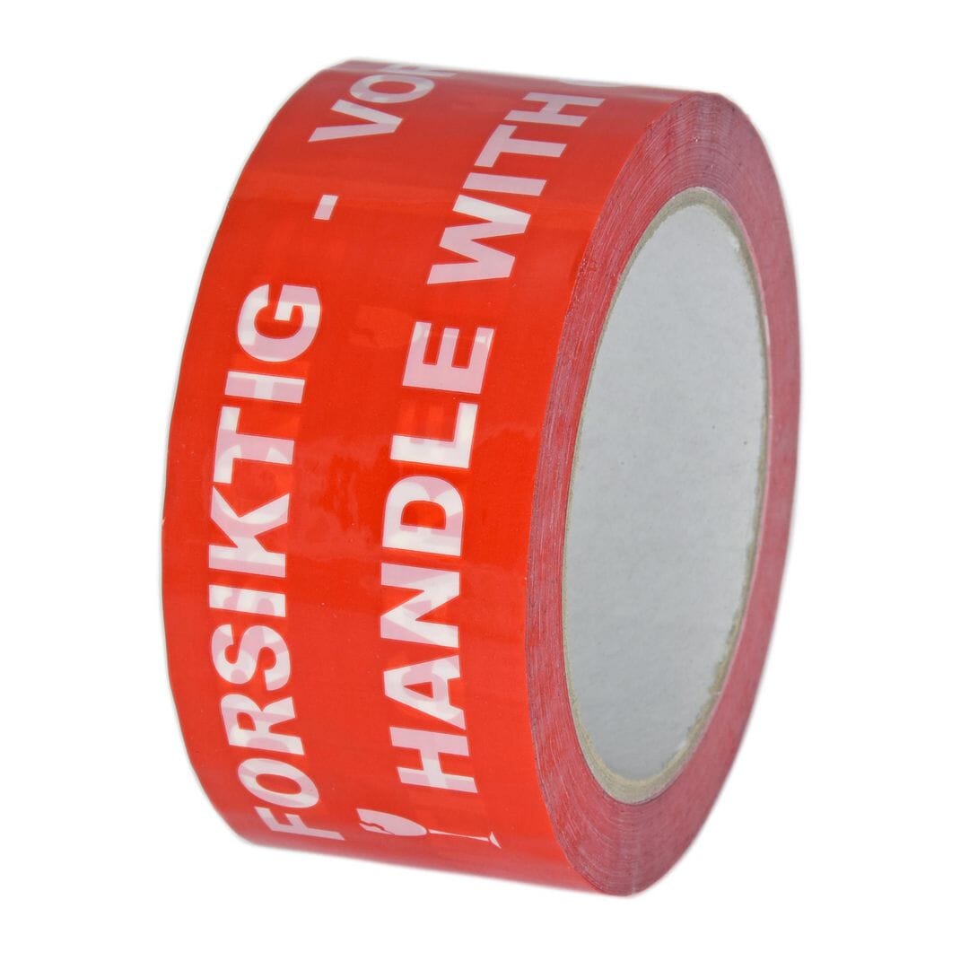 Emballasjetape for merking av forsendelser. Tapen har teksten "Forsiktig" på tre forskjellige språk: Norsk / Engelsk /Tysk.