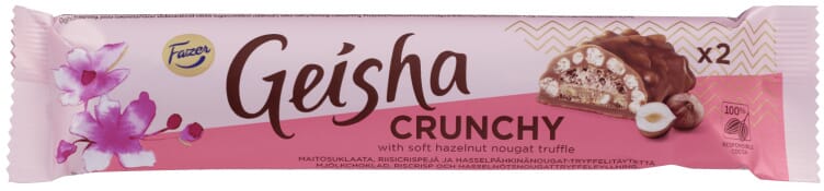 Fazer Geisha Crunchy sjokoladebar er en himmelsk kombinasjon av myk nougat og knasende hasselnøtter, dekket av Fazers silkemyke melkesjokolade. Når du trenger litt ekstra energi midt på dagen, eller hvis du ser etter den perfekte snacken til kaffepausen, er denne sjokoladebaren et utmerket valg. Den kommer i to biter – del den med en venn! Laget av 100 % ansvarlig produsert kakao, og gelatinfri.