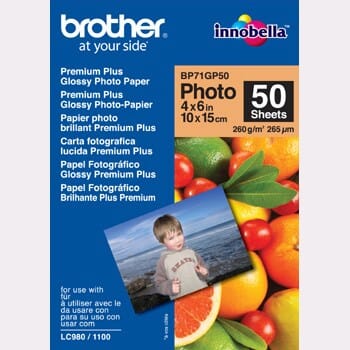 Skriv ut profesjonelle bilder med Brother-skriveren og Brother Innobella Premium Plus-fotopapiret. Med den glatte, kjemiske overflaten bevarer Innobella-blekket og forhindrer flekker siden tørkehastigheten øker. Det tykke papiret er prikken over i-en som gjør at utskriften er verdig en plass på veggen. Brother Innobella Premium Plus-fotopapiret leveres i pakker på 50. Med dette kan du lage kopier av favorittbildene dine eller skrive ut profesjonelle bilder for kunder eller utføre studioarbeid.