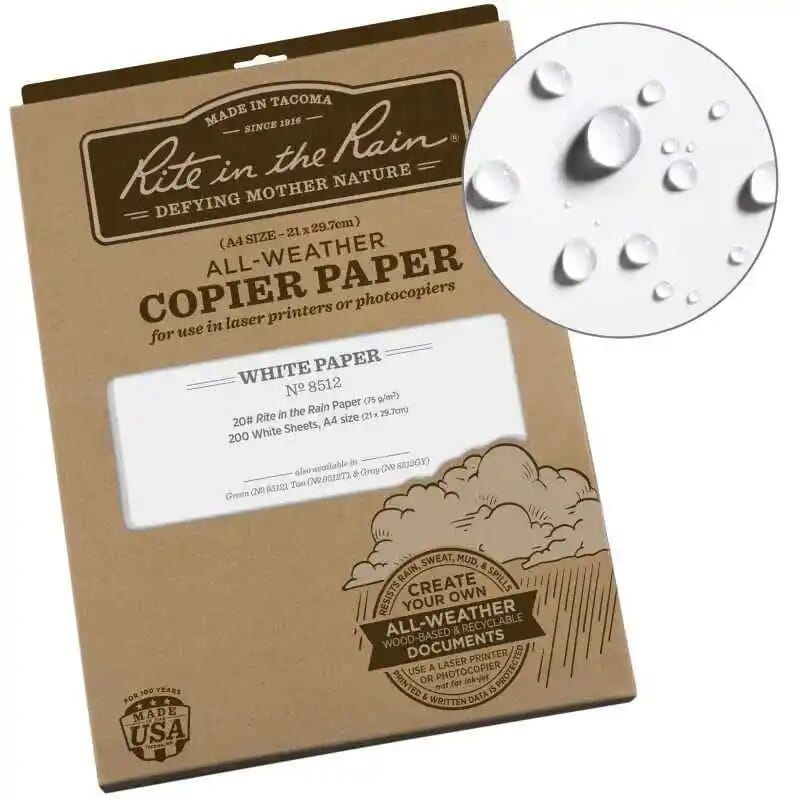 Rite in the Rain® All-Weather Printer Paper (200 ark) – værbestandig laser-/kopipapir som tåler regn, søl og gjørme uten å svekke trykkket, og lar deg produsere skarpe dokumenter, kart og skjemaer direkte fra kontormaskiner.