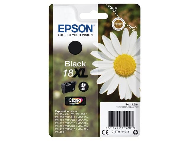 Farge: SvartKapasitet: opptil 470 A4-siderEkstra stor kapasitet til utskrift av store volumerEpson Claria Home Ink serienFyldige dokumenter og fine bildeutskrifterEpson-serie: DaisyKompatibel med: Expression Home XP-30, XP-102, XP-202, XP-205, XP-212, XP-215, XP-225, XP-302, XP-305, XP-312, XP-315, XP-322, XP-325, XP-402, XP-405, XP-412, XP-415, XP-422, XP-425