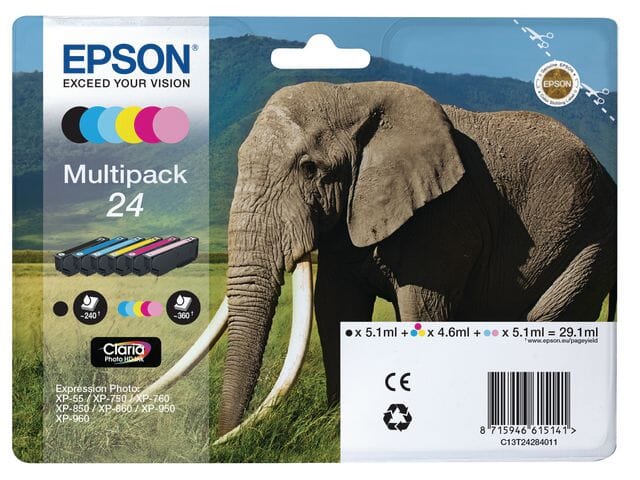 Forbedre familiebildene, og skriv ut utrolige bilder i fotografisk kvalitet med Epsons Claria Photo HD-blekk Epson Claria Photo HD-blekk er ideelt for fotografer som ønsker å lage og vise bilder av enestående kvalitet. Epson Claria Photo HD-blekk gir enestående fotoutskrifter med myke tonegraderinger og dype, naturlige sortfarger og hudtoner. Best egnet i kombinasjon med en fotoskriver. Gir flotte og profesjonelle fotoutskrifter takket være et større antall blekkdråper. Reduser kostnadene ved å kun bytte ut fargen du går tom for. For optimale resultater og mer holdbare utskrifter, fungerer dette blekket best sammen med Epsons blekkskrivere. - Farge: sort, gul, cyan, magenta, lys cyan, lys magenta - Utskriftskapasitet: Opptil 360 A4-sider - Volum: 29,1 ml - Epson Claria Photo HD Ink-serien - Flotte og profesjonelle fotografiske utskrifter - Epson-serie: Elephant - Kompatibel med: XP-55 / XP-750 / XP-760 /XP-850 / XP-860 / XP-950 / XP-960