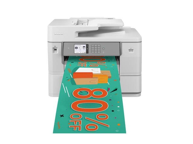 Brother MFCJ6959DW er en profesjonell multifunksjon farge blekkskriver for utskrift i opptil A3/langt format. Utformet for bedrifter som trenger en fleksibel skriver som kan skrive ut, kopiere, skanne og fakse med den ekstra fordelen av å skrive ut langt format med papirrull. Du kan enkelt skrive ut bannere, skilt, plakater, panoramabilder og salgsfremmende markedsmateriale i høy kvalitet, og deretter kutte til ønsket lengde med den automatiske kutteren. Skriveren har kablet og trådløs nettverkstilkobling, mobil tilkobling med appen Brother Mobile Connect og og Near-Field Communication (NFC) for sikker autentisering, mobil utskrift og skanning. Den første siden skrives ut på under 5 sekunder og utskriftshastigheten er på opptil 30 ipm i sort-hvitt og farger med MAXIDRIVE skrivehodeteknologi. Skriveren har 250 arks øvre papirmagasin, papirrull eller 500 A4-arks nedre papirmagasin, 50 arks tosidig A3 automatisk dokumentmater (ADF), automatisk tosidig A4/A3 utskrift, kopi, skann og faks og 8,8 cm farge berøringsskjerm. Sammen med lavt strømforbruk er denne skriveren ideell for butikker, travle kontorer og arbeidsgrupper som er ute etter et mer miljøvennlig utskriftsalternativ. Standard blekkpatroner LC427BK er på opptil 3000 sider i sort-hvitt og LC427C/M/Y på opptil 1500 sider i farger. Som tilbehør finnes XL høykapasitet blekkpatroner LC427BKXL for utskrift av opptil 6000 sider i sort-hvitt og LC427CXL/MXL/YXL for opptil 5000 sider i farger. Annet tilbehør: underskap med hjul, utvidet garanti og oppgraderinger. Skriveren er miljømerket nordiske Svanen og Blue Angel, har tre årsgaranti.