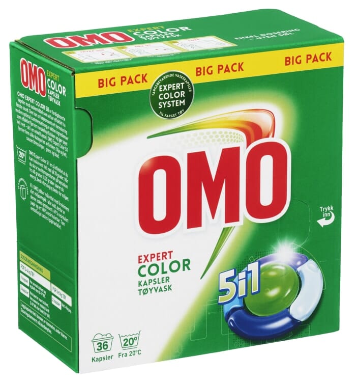 Omo Expert Color Trippel Dose til farget tøy er engangskapsler som løser seg lett opp i vann, og virker effektivt fra første stund.