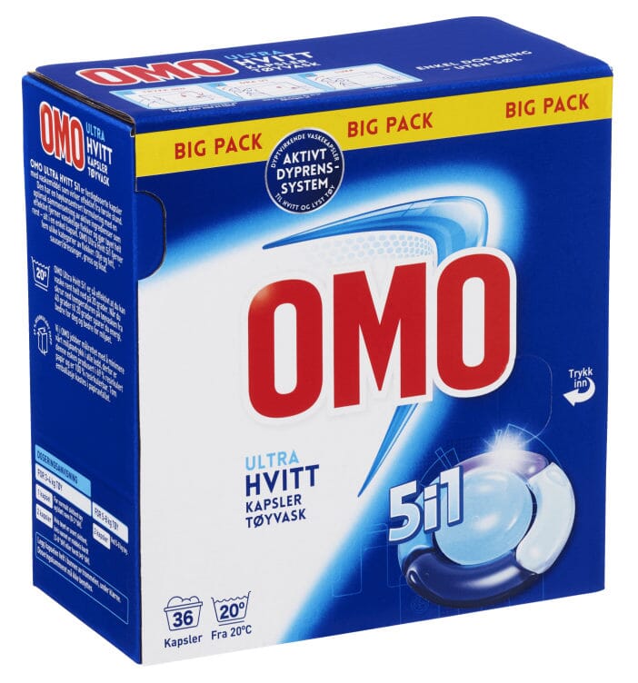 Omo Ultra Hvitt Trippel Dose til hvitt og lyst tøy er engangskapsler som løser seg lett opp i vann, og virker effektivt fra første stund.
